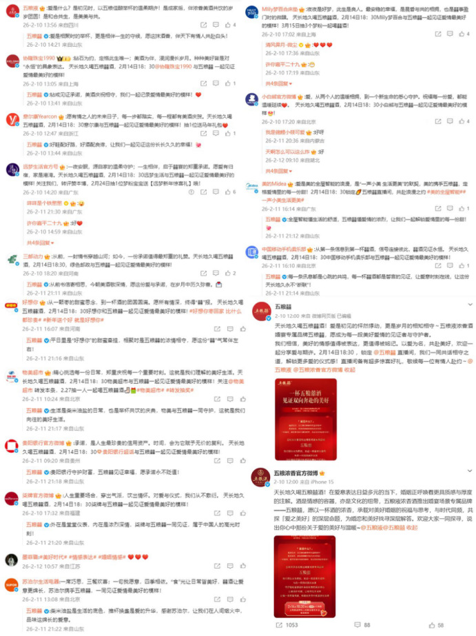 品牌发布期间,五粮囍怀揣弘扬优秀婚恋观的初心,在官微发出一份关于“爱与长久”的开放式倡议,意外引发近50位不同领域企业蓝V的主动共同发声。在这场温暖互动中,五粮囍更像是一个倡议的发起者,而后被智慧家电、国潮运动、风尚服饰、珠宝文旅、品质家居等众多同行者真诚的表达,共同推到了公众视野的中央,形成“众星捧月”的热点效应。这场源于共同理念的“隔空对话”,不仅放大了社会对健康文明婚恋观的关注,也生动展现了当代企业向上、向善的价值追求。